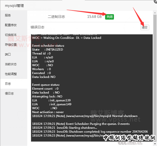 3、在后台首页,软件点击 MySQL,弹窗中选择日志,会看到错误日志,我这个宝塔面板是为了写文章新建的,这样也有 1M 多的错误日志,可见如果是正常网站用的一年半载下来也会有几百 M 甚至更多。