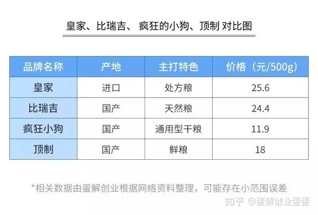 但作为一门生意,顶制狗粮目前也遇到一些困难。虽然配方好、但原料种类繁多导致成本高,相比于疯狂小狗最低五六元一斤,顶制最低的是9元/斤,虽然对比皇家、比瑞吉还是具有很高的性价比,但线上品牌知名度小,线下又没有大面积铺渠道,销量一直没有大的突破。